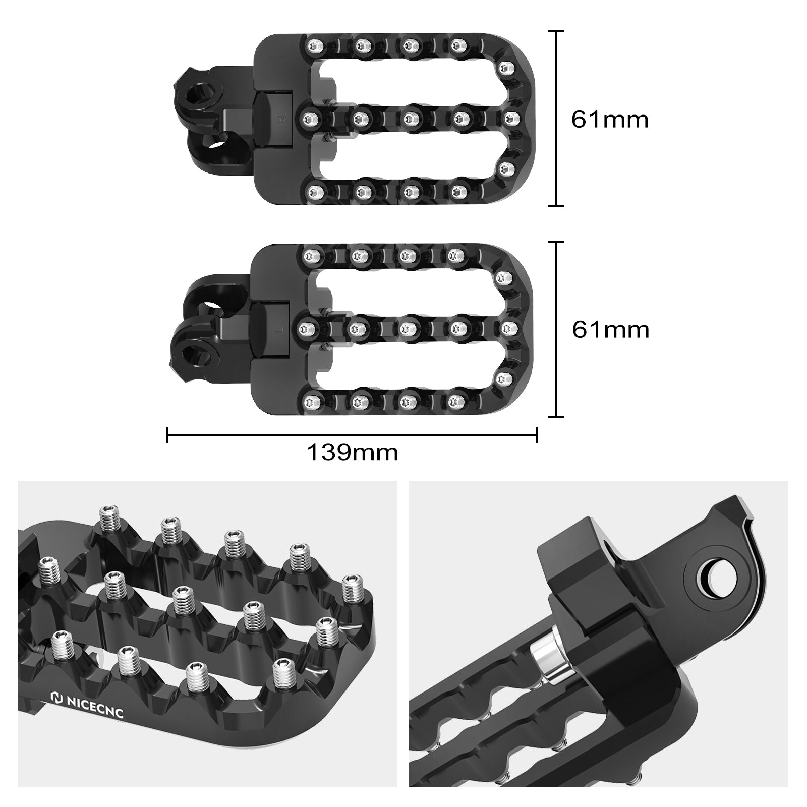 - Larger surface - The NICECNC Larger pegs are 104mm long and 61mm wide. helps to handle the bike when riding in stand. Fatigue-free riding standing up.