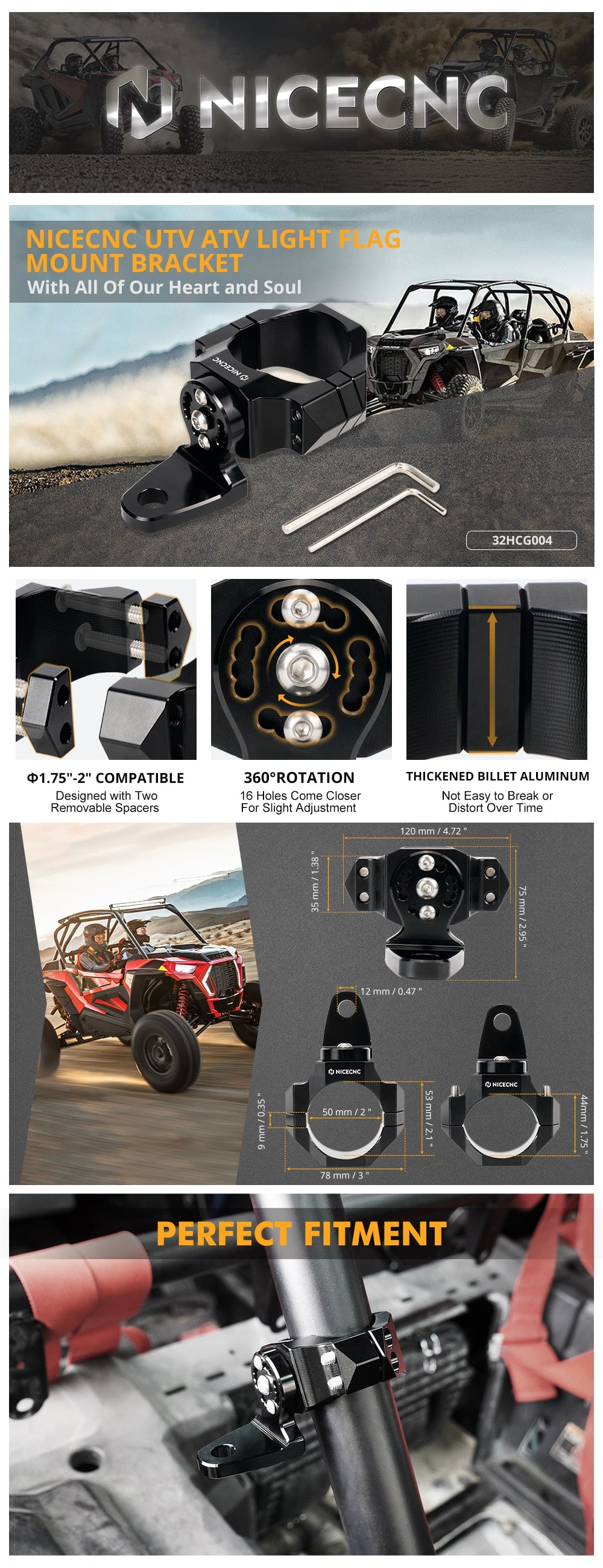 - 16mm Thick Billet Aluminum - CNC-machined from premium 6061 Aluminum, provide strong support for Chasing Light /Flag/Whip Light/Light Bar. Not easy to break or distort over time.