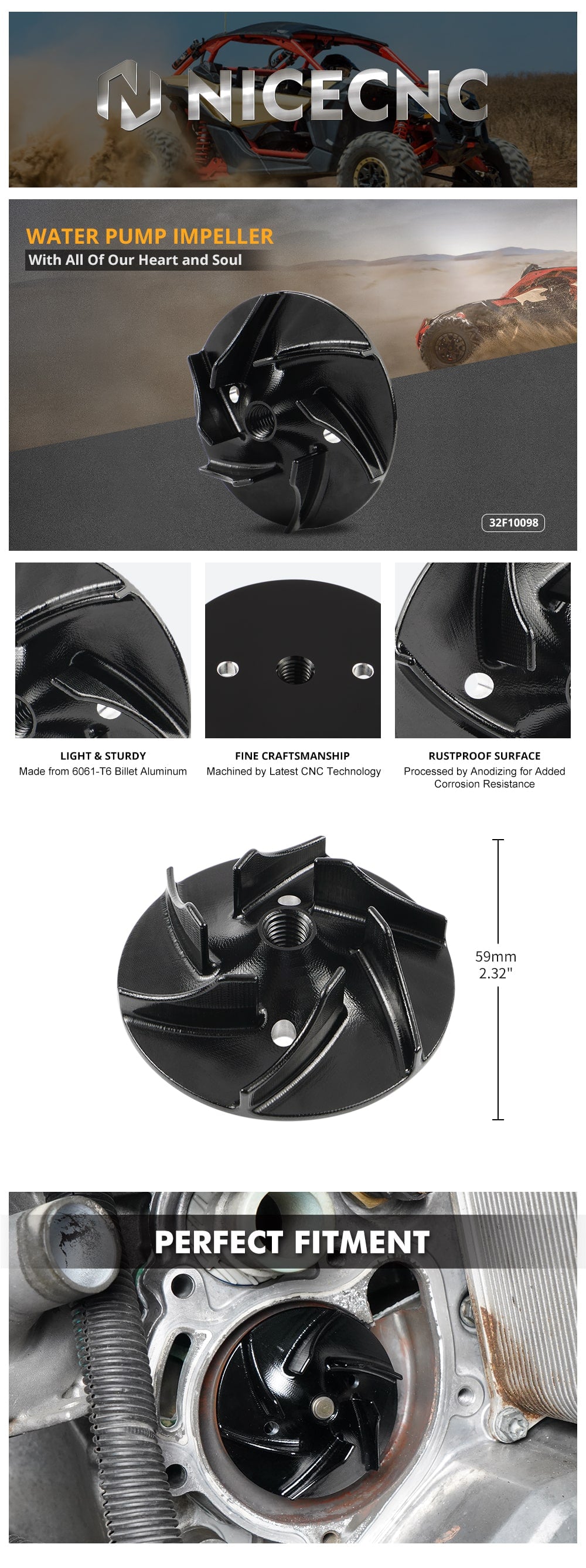 Thicker Aluminum - Replace the flimsy stock with our 6061-T6 billet aluminum impeller. No breakage and normally distribute coolant throughout the cooling system of your UTV.