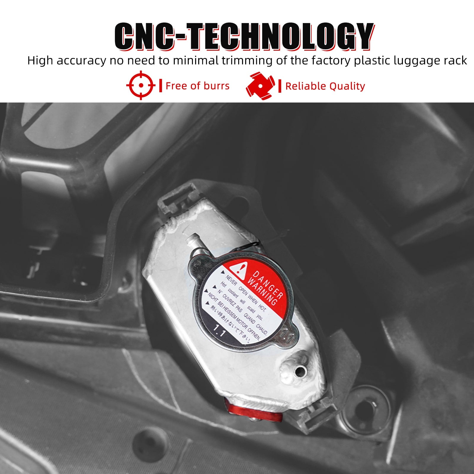 - Precision CNC Machining - Ensures high accuracy for a perfect fit and easy installation.No need to minimal trimming of the factory plastic luggage rack kit to accommodate the coolant reservoir.