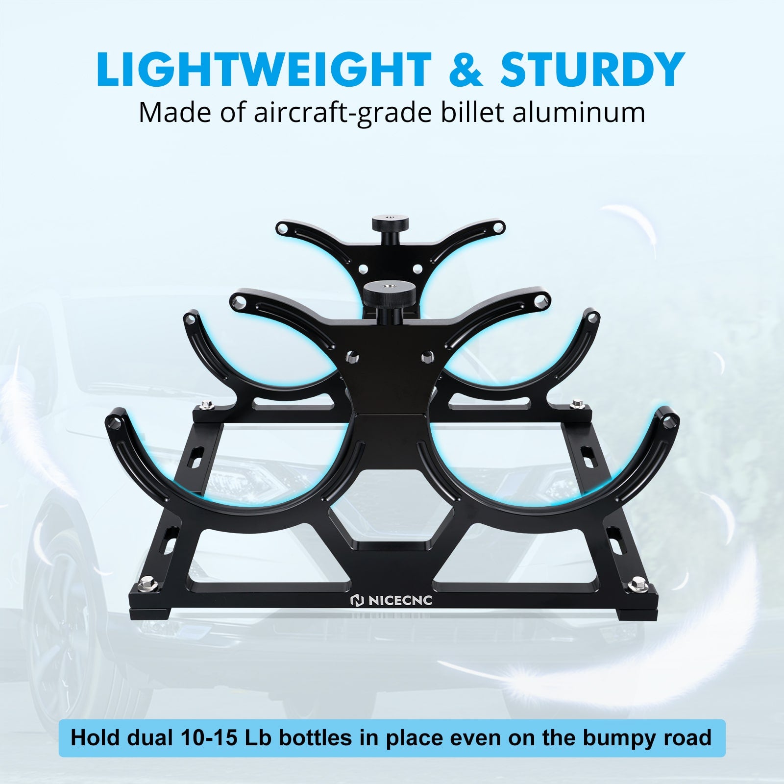 - Made of premium billet aluminum, super lightweight and sturdy. Hold dual 10-15 Lb bottles in place even on the bumpy road.