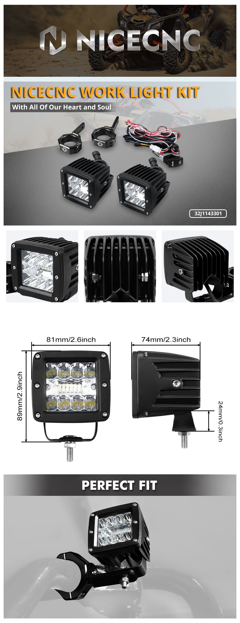 - Complete Kit - Work light kit contains 2 LED lights, 2 adjustable mounts, and a complete wiring harness for easy installation without drilling.