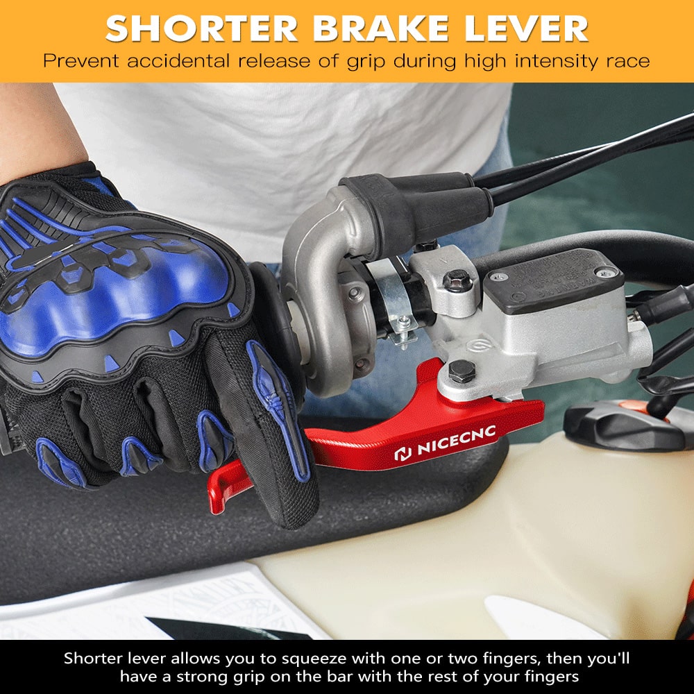 - Improve Safety - Shorter length than the stock lever. Allows you to squeeze the lever with one or two fingers without releasing your grip with the rest of your fingers, with no potential risks of trapping them between the lever and the bar during high intensity race conditions.